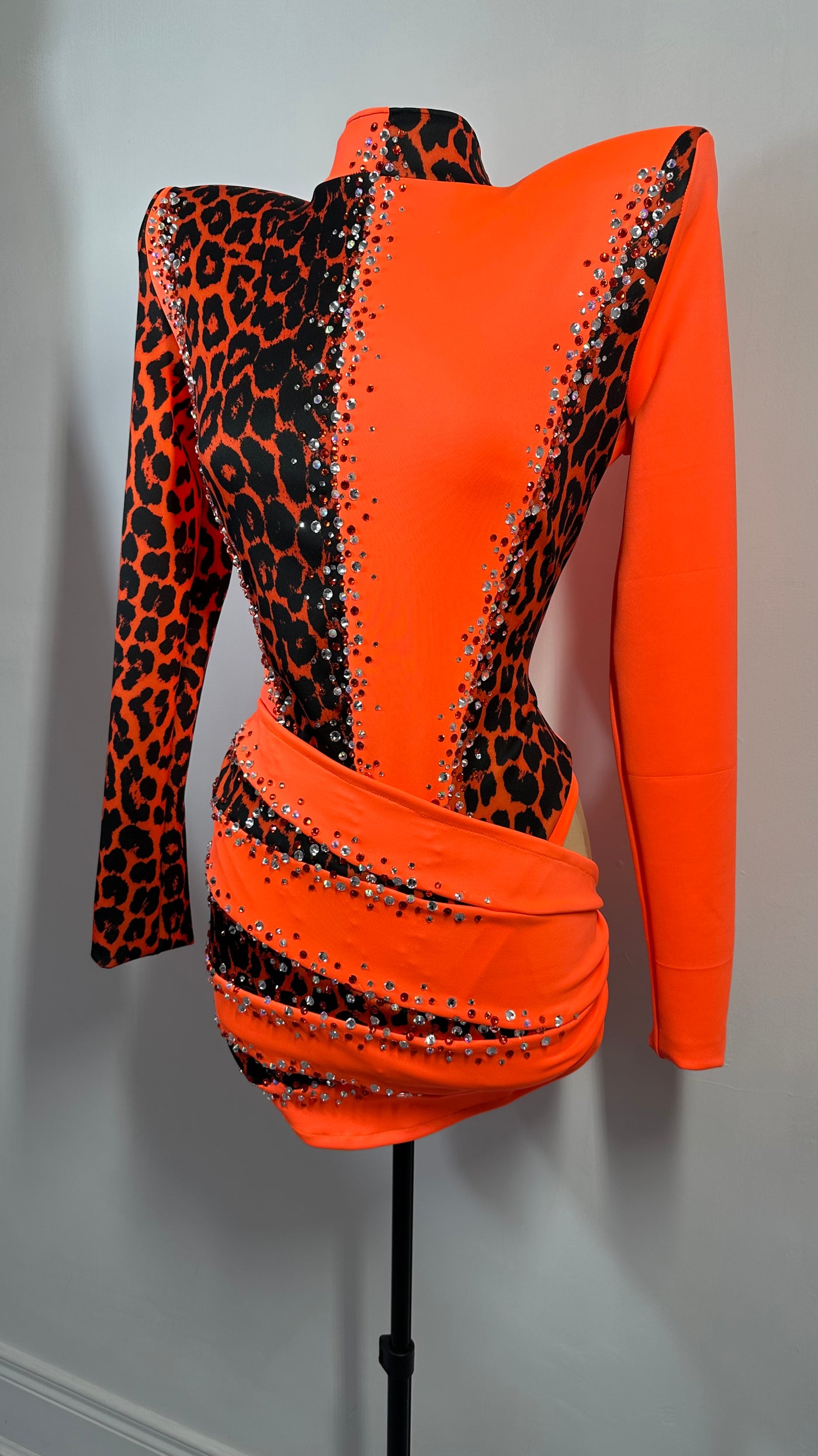 Orange scuba and orange leopard print leotard with wrap skirt. Stone with clear, ab, orange and black crystals