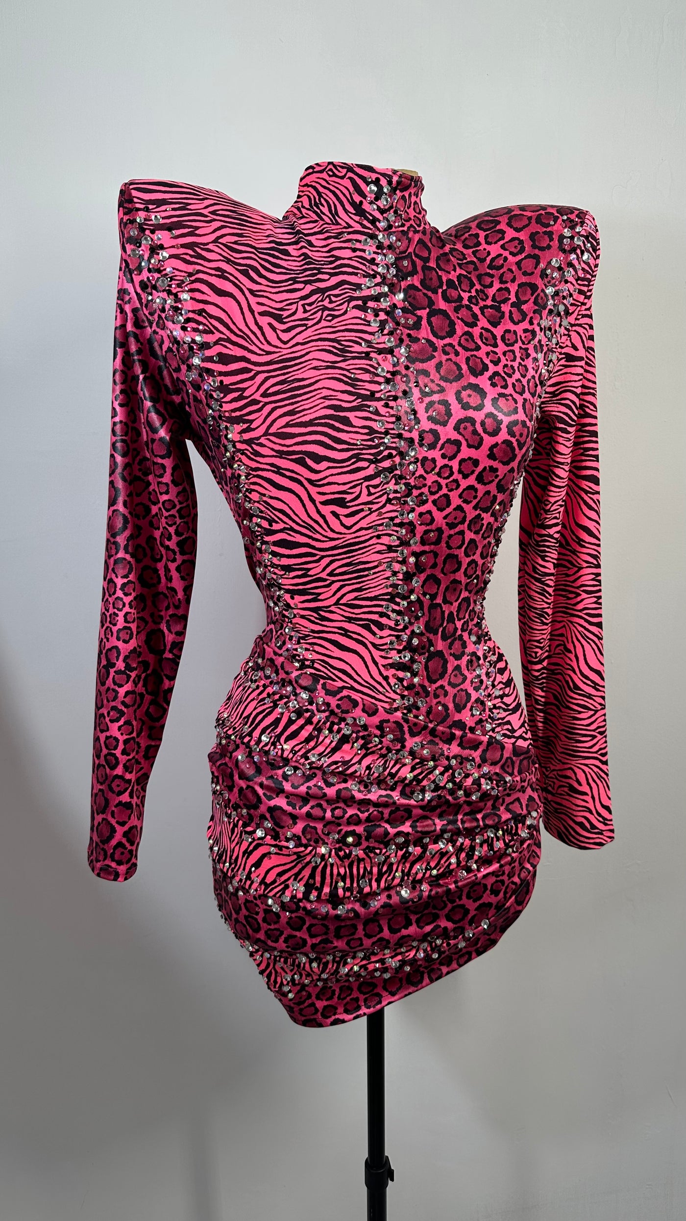 Pink tiger print and pink leopard print leotard with wrap skirt. Stoned with clear, ab pink and black crystals