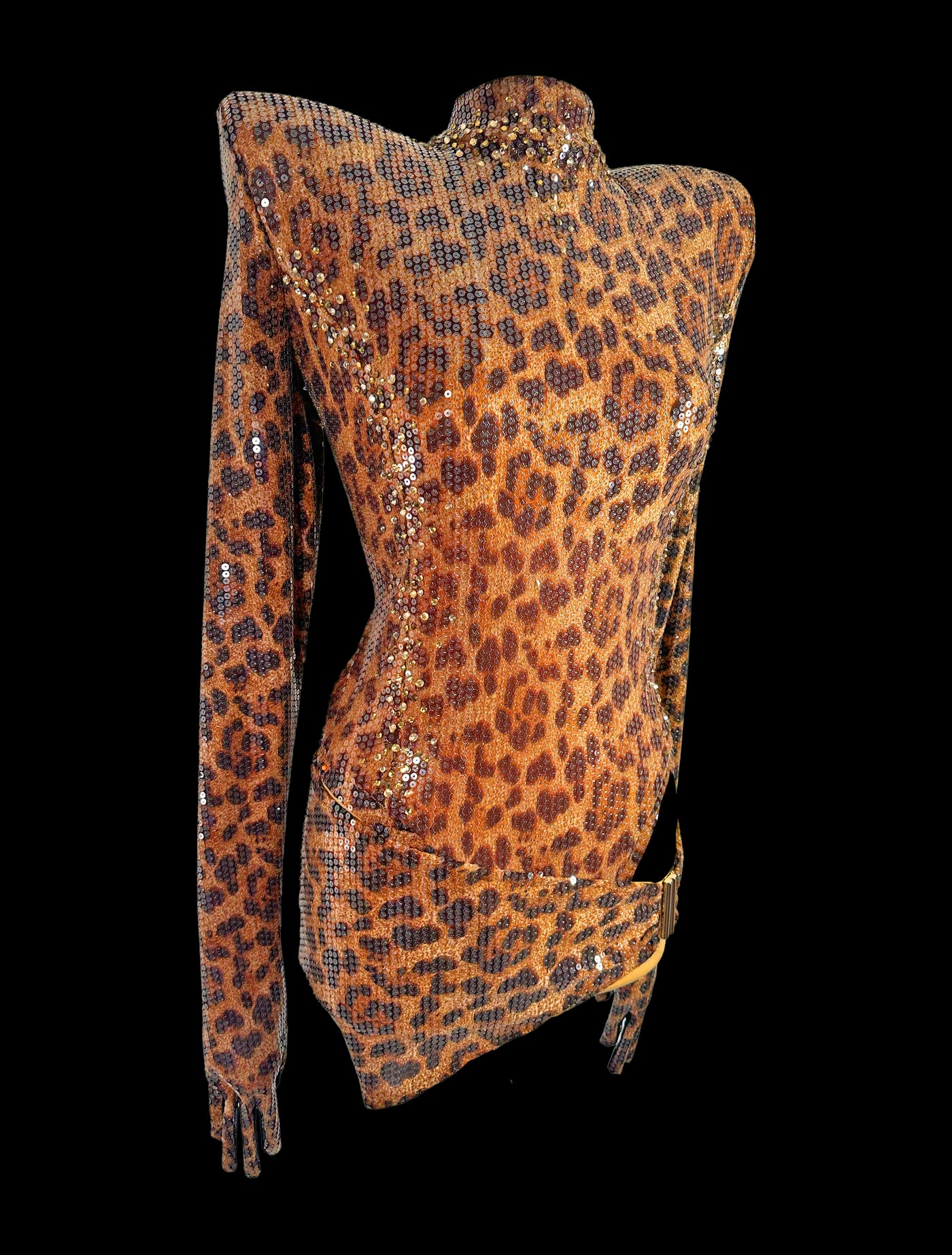Sequin leopard print leotard with rhinestones, glove detail and detachable skirt. All sizes available.
