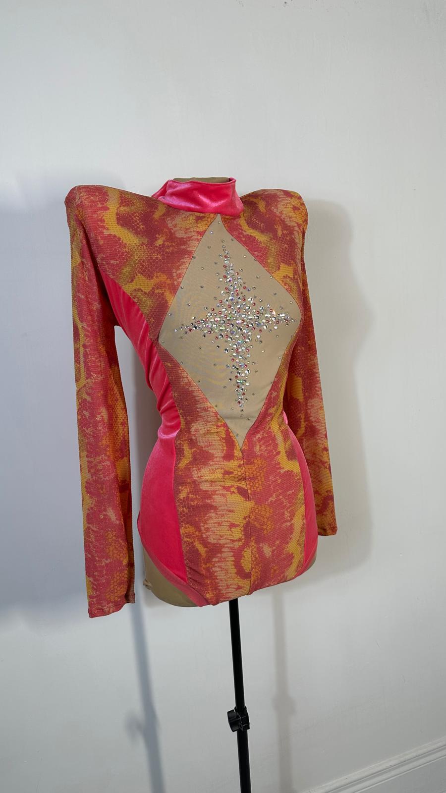 pink and yellow print leo with nude panel stoned with clear ab and pink crystals. matching wrap skirt not in the photo as it will be made to measure