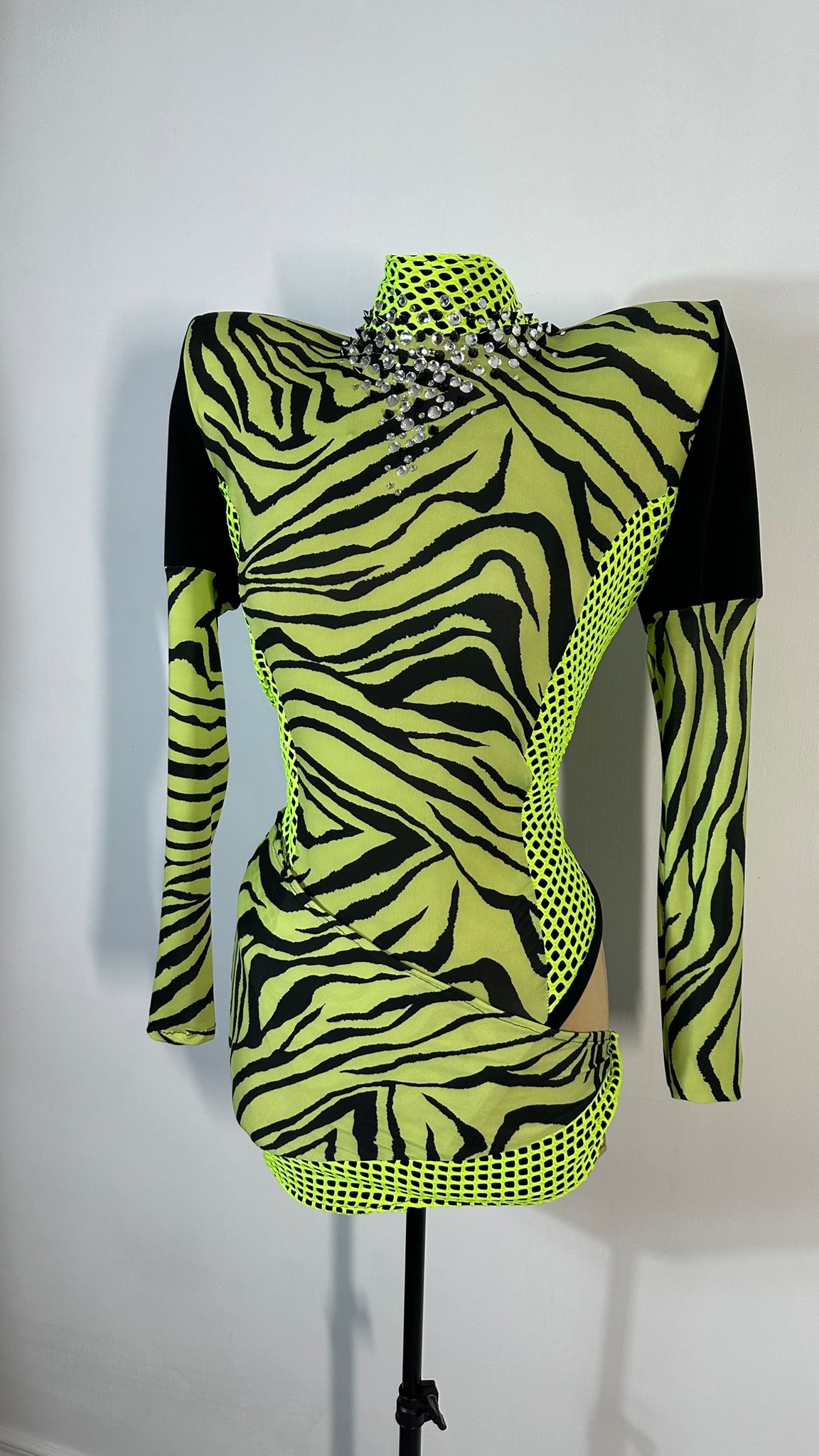 green tiger leo with mesh and black paneling. comes with wrap skirt. embellished with black spikes and clear stones