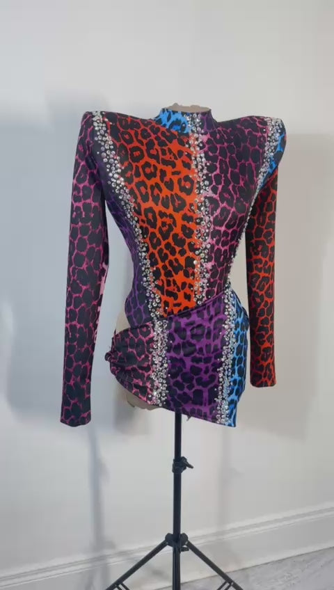 colored cheetah print paneled scuba leo and wrap skirt. Stoned with clear and ab crystals. UK 12-20 altered to your...