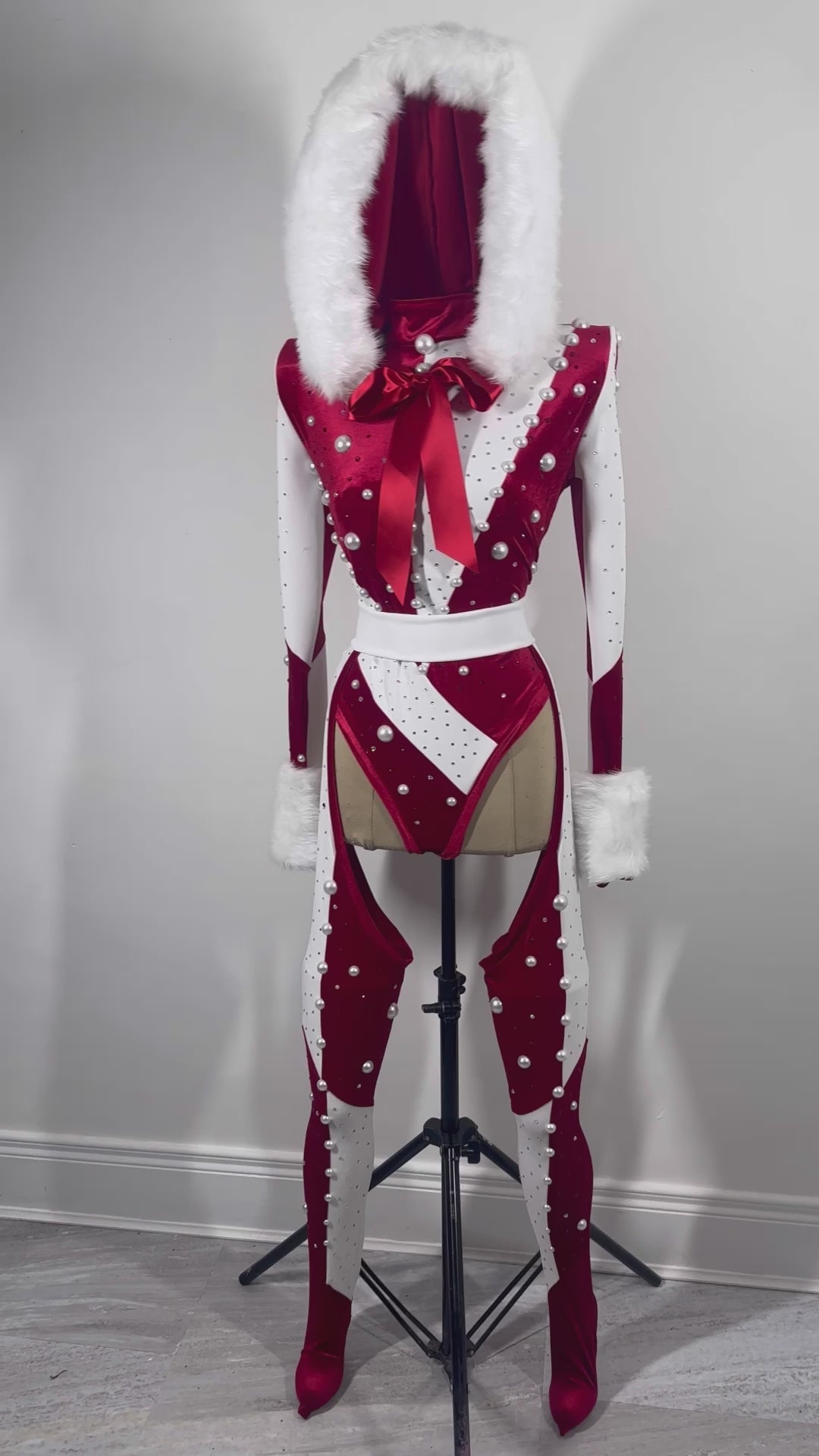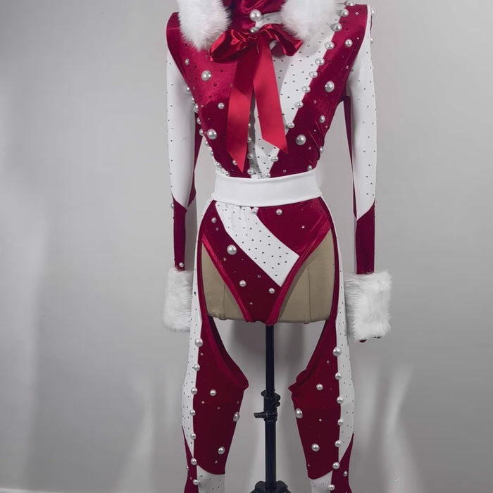 Candy cane   Red velvet and white scuba panel leotard and chaps. Embellished with Pearls, red, clear and ab crystals...