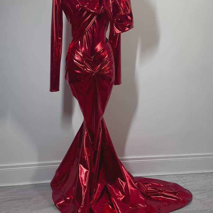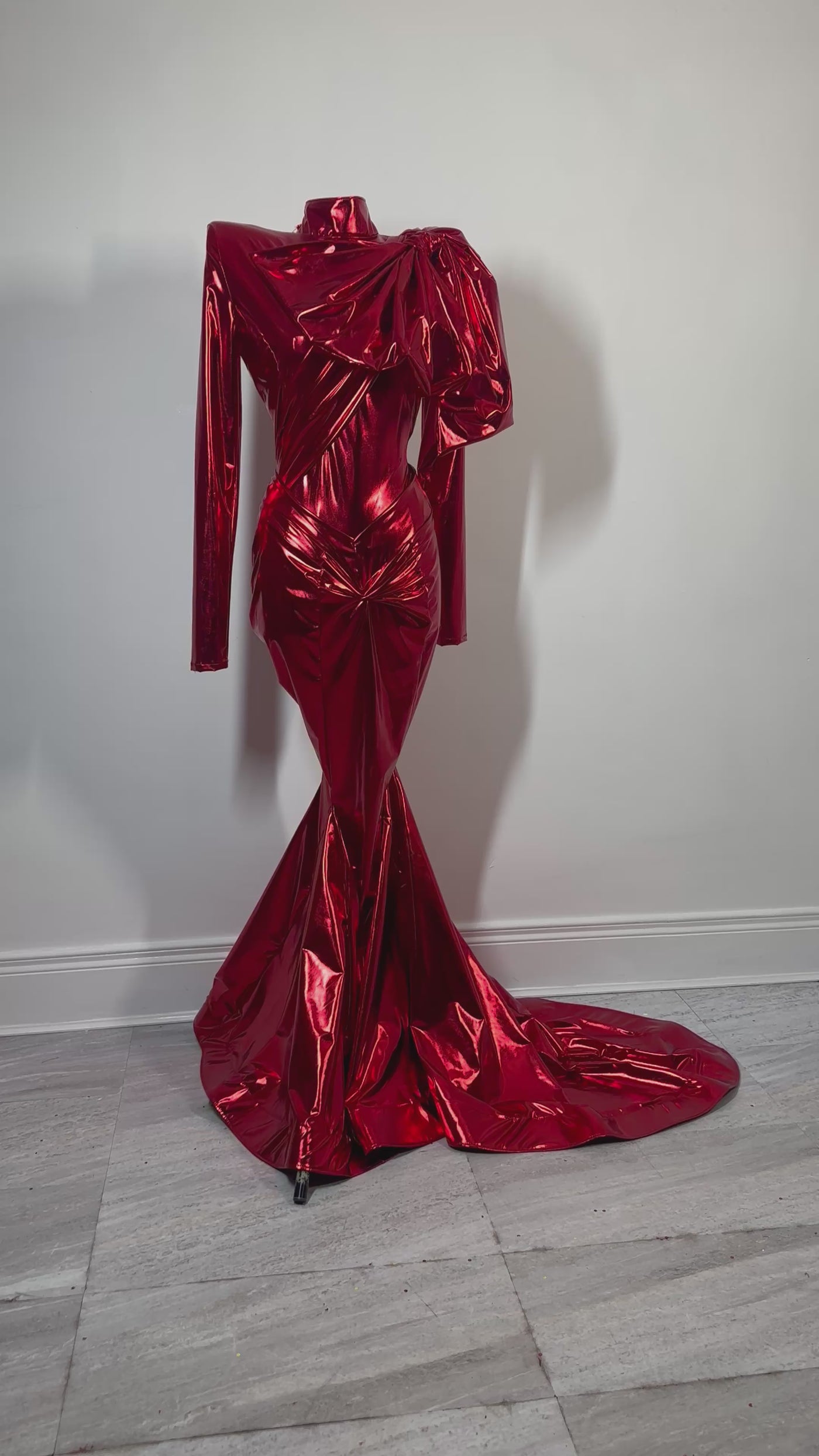 Red foil lamé leotard with a large bow detail and detachable trumpet gown skirt.
