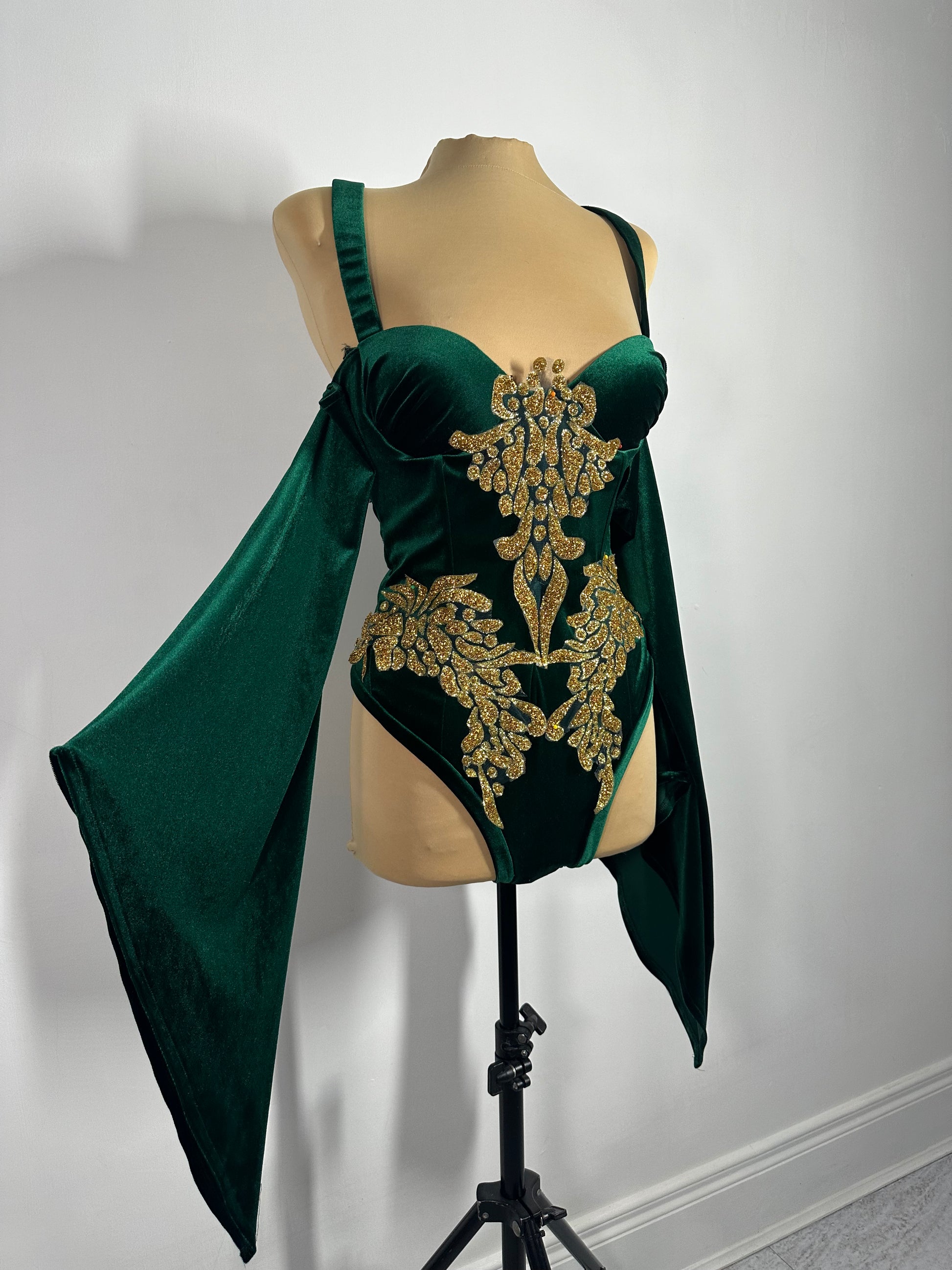 Green velvet leotard with wizard sleeves embellished with gold glitter appliqué