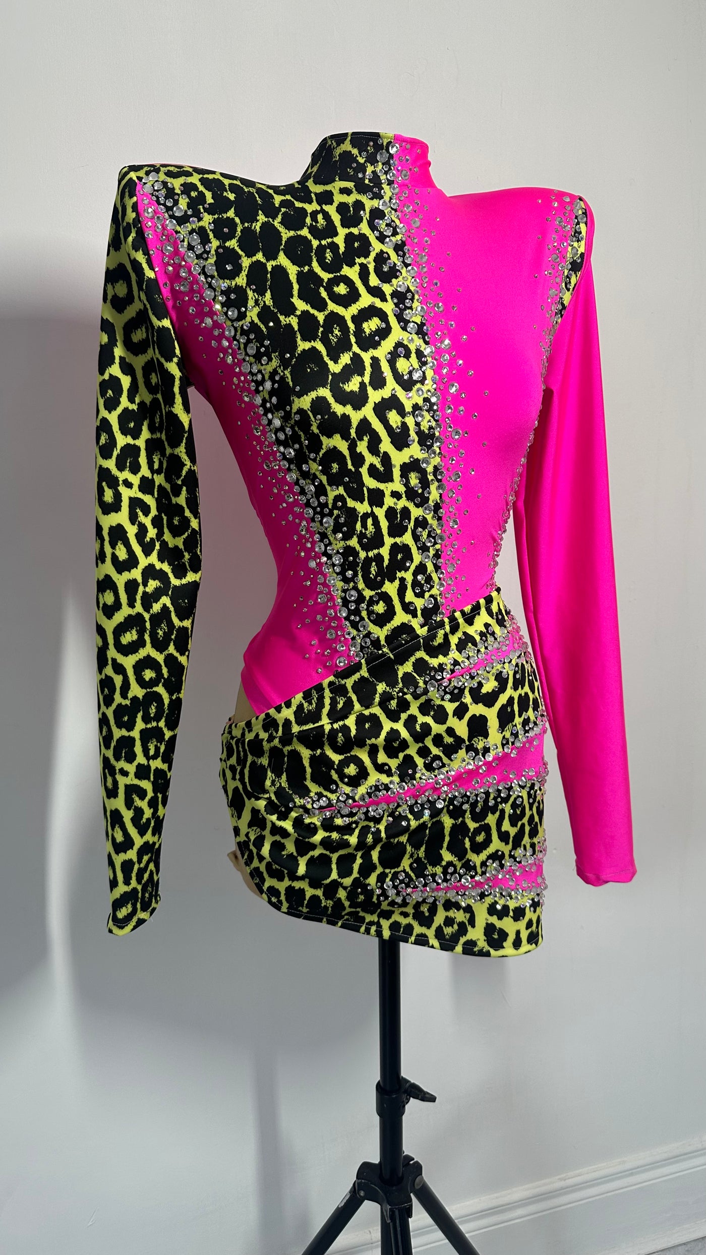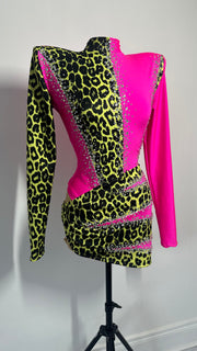 Neon green snake print and pink lycra leotard. Embellished with Clear and ab crystals. Matching Wrap skirt Made to measure