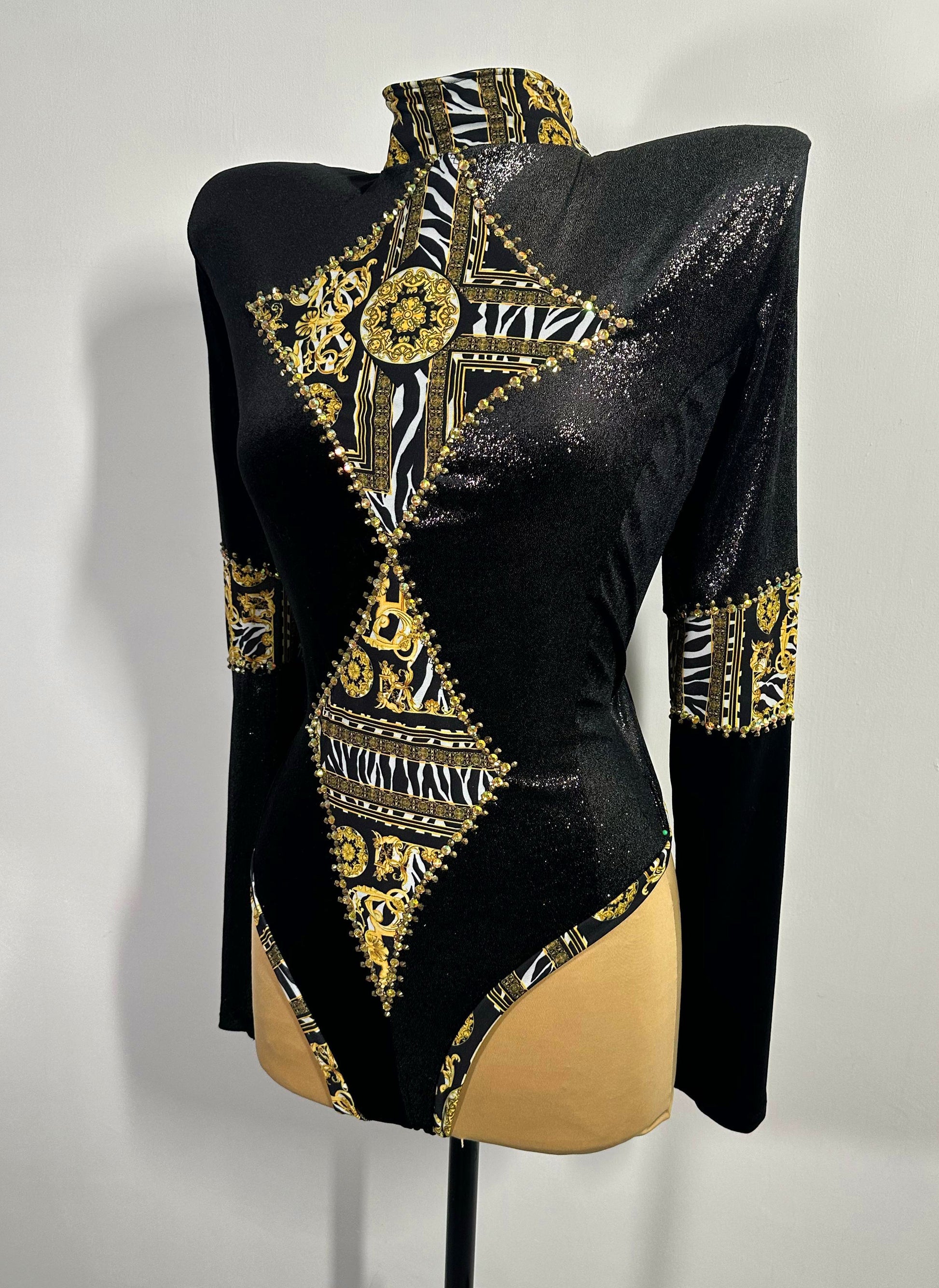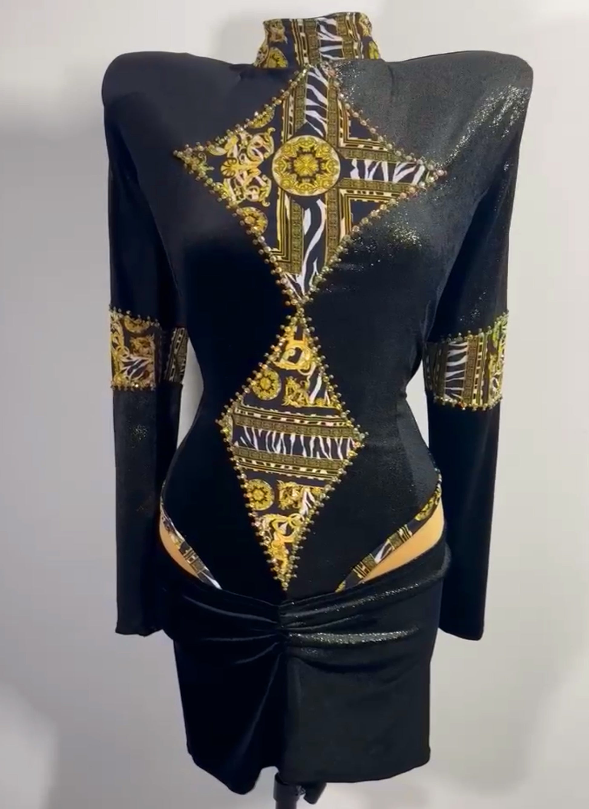 Black velvet and black glitter velvet with baroque print detail embellished with gold crystals. Includes detachable skirt.