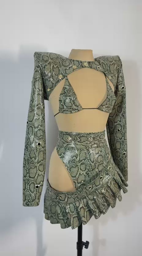 Green snake bikini top, bolero, high waisted pant and pleated skirt