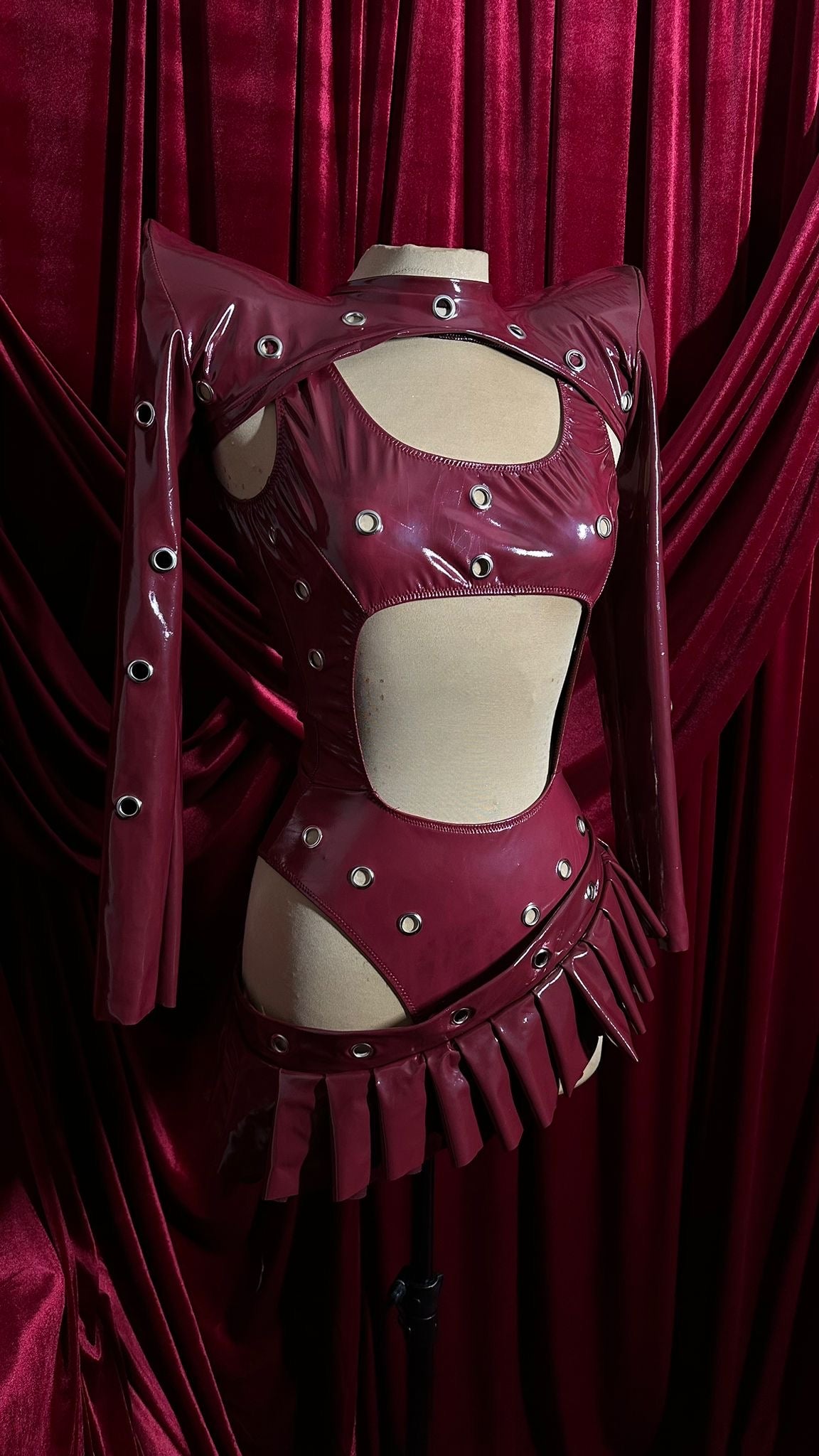 Burgundy pvc singlet, bolero and mini pleated skirt. Gold eyelet detailing